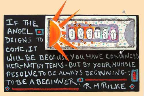 if the angel: 14"w X 8"h: pastel, wood, sequins, pins, foil