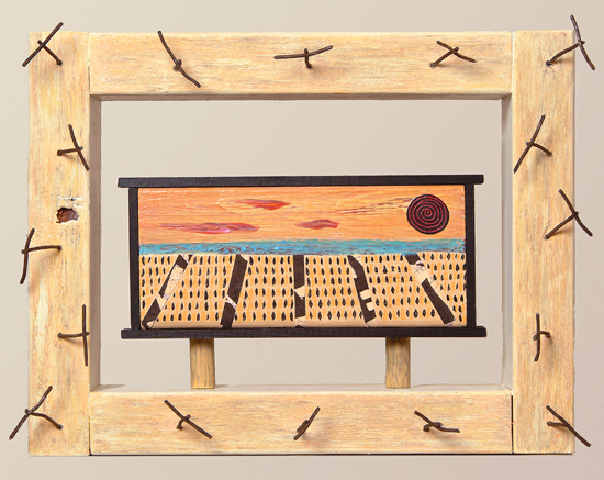 winter corn: 13"w X 10"h: paper, paint, oil pastel, barbed wire, wood