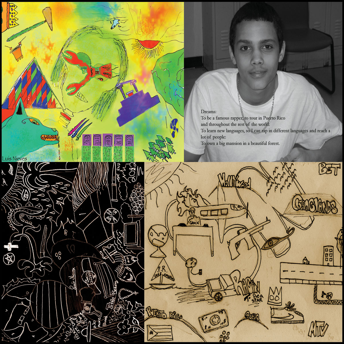 Multimedia Arts and Technology Residency: Students use Apple technology/software (Garage Band, Adobe Photoshop), and fundamental art tools/supplies to create: soundtracks/songs, animation, video, photography, eBooks, fine art, creative writing, large-scale photo-collage prints.